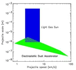 A dust accelerator is a critical facility to develop, test, and calibrate space dust instruments.[8] Classic guns have muzzle velocities between just a few 100 m/s and 1 km/s, whereas meteoroid speeds range from a few km/s to several 100 km/s for nanometer sized dust particles. Only experimental light-gas guns (e.g. at NASA's Johnson Space Center, JSC[9]) reach projectile speeds of several km/s up to 10 km/s in the laboratory. By exchanging the projectile with a sabot[10] containing dust particles, high speed dust projectiles can be used for impact cratering and dust sensor calibration experiments.