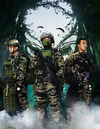The regiment was established in on June 25, 1962,[7] primarily trained in both unconventional warfare and psychological warfare, which started as the 1st Special Forces Company before it evolved into a group and then to a regiment.[6][5] The regiment has close ties and trains with the United States Army Special Forces (Green Berets)[4] When the unit was created, around 12 officers and 105 enlisted soldiers formed the unit.[7]