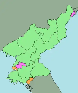 | Rason | 라선특별시 | 羅先特別市 | Special city | KP-13 | 205,000 | 746 | 275 | Rajin-guyok | Kwanbuk | North Hamgyong | 2010 |