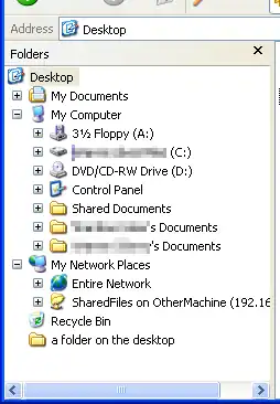 Virtual folders do not actually exist on the file system; they are instead presented through Windows Explorer as a tree of folders that the user can navigate. This is known as the Shell namespace. On Windows XP systems, the root of this namespace is the Desktop virtual folder, which contains the My Documents, My Computer (Computer from Windows Vista to 8.1 and This PC from Windows 10), My Network Places (Network Neighbourhood in Windows 95 and 98) and Recycle Bin virtual folders. Some virtual folders (like Desktop) have an accompanying special folder that is a reference to a directory on the physical file system. Windows Explorer displays the combined contents of a virtual folder and its associated file system folder to the user. This can be seen in Figure 1, which shows the Folder view in Windows XP's Explorer; in the Desktop virtual folder, the four standard virtual folders can be seen, as well as an additional folder, "a folder on the desktop", which is a real folder located in the Desktop directory in the user's profile.