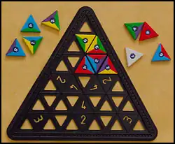Spectrangle is a triangular tile-based abstract strategy game invented by Alan John Fraser-Dackers, Maxwell Graham Gordon and Lester Wynne Jordan.[1] The principles behind the game are based on the work of British mathematician Percy Alexander MacMahon. The original game was for up to 8 players and used 60 tiles. A later more compact version for up to four players uses 36 tiles. It is this version that is described here.