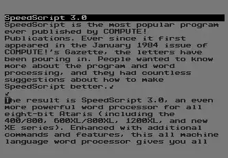 - ^ Brannon, Charles (May 1985). "SpeedScript 3.0: All Machine Language Word Processor For Atari". Compute! (60): 103–111. ISSN 0194-357X. Retrieved 1 March 2015.