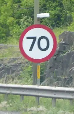 Variable speed limits are used on some major traffic roads. These can be changed in response to weather, traffic levels, time of day or for other reasons with the currently applicable speed limit displayed using an electronic road sign. Signs with the speed shown in a red circle are compulsory, signs where the speed is not within a red circle are advisory and exceeding these speeds while driving safely within the applicable national speed limit is not in itself an offence.[15] Variable speed limits were introduced on some congested major routes as an element of controlled motorway techniques to improve traffic flows for given prevailing conditions.[16] Part-time variable speed limits may also be used outside schools.