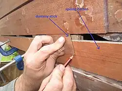 When used for making a new plank for a boat a piece of timber the same length as the desired plank but both thinner and narrower is cut. This is called the spiling batten. This is then temporarily attached to the boat in the place of the plank required. The shape of the plank required can then be traced onto the spiling batten using a compass, or a dummy stick. The spiling batten can then be lifted out and placed on the new stock, and moved around to find the optimum use of the stock material, then using the same compass or dummy stick, the exact shape required can be traced off the spiling batten onto the new stock, ready to be cut out.[3]