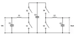 The split-pi converter is a type of DC-to-DC converter that has an output voltage magnitude either greater than or less than the input voltage magnitude. It is a switched-mode power supply with a similar circuit configuration to a boost converter followed by a buck converter. Split-pi gets its name from the pi circuit due to the use of two pi filters in series and split with the switching MOSFET bridges.