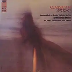 "Spooky" is originally an instrumental song performed by saxophonist Mike Sharpe (Shapiro), written by Shapiro and Harry Middlebrooks Jr, which first charted in 1967 hitting No. 57 on the US pop charts and No. 55 on the Canadian charts.[4][5] Its best-known version was created by James Cobb and producer Buddy Buie for the group Classics IV when they added lyrics about a "spooky little girl". The vocalist was Dennis Yost.[6] The song is noted for its eerie whistling sound effect depicting the spooky woman. It has become a Halloween favorite.[7] In 1968, the vocal version reached No. 3 on the U.S. Billboard Hot 100,[8] No. 1 in Canada,[9] and No. 46 in the UK.[10]