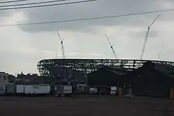 The first steel girder was put in place on August 19, 2008.[53] The arena was reported by The New York Times to be 55% complete on March 27, 2009.[54] The last major beam for the roof was topped out on April 14, 2009.[55] Enclosure panels started going up on May 7, 2009.[56] The first section of the Red Bull Arena roof was completed in August 2009.[57] The underground drainage and turf-heating system installation began on August 18, 2009.[58]
