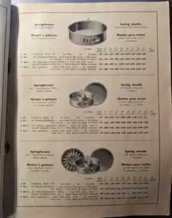 The springform was invented in Germany by the company CHG. At the time of founding CHG in 1882 produced many items related to baking. An example of a very early spring form is from a company catalog given out around the 1910's.