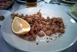 Fried squid (calamari fritti) is a dish in Mediterranean cuisine, consisting of batter-coated, deep-fried squid (fried for less than two minutes to prevent toughness), which is served plain, with salt and lemon on the side.