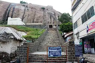 The Ranganathaswami temple in Namakkal, a town in Namakkal district in the South Indian state of Tamil Nadu, is dedicated to the Hindu god Vishnu. The temple is one of the 108 Purana Kshethrams of Vaishnavate tradition. The temple is constructed in the Dravidian style of architecture and rock-cut architecture, the temple is located in the Salem–Namakkal–Trichy Road. Based on the architectural features, historians believe that the temple was built during the 6th century by the Adiyamans[1] also called Satyaputras as evident from the inscription mentioning the temple as 'Adiyendra Vishnu Gruham' or 'The house of Vishnu of the Adiyaman kings'.[2][3] This temple plays an important role in history as it has four main Sanskrit inscriptions dated around 6th century to 8th century CE, and is also used to date another cave temple (Narasimhaswamy Temple, Namakkal) excavated in the same hill, as that cave temple as no Inscriptions.