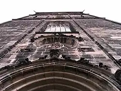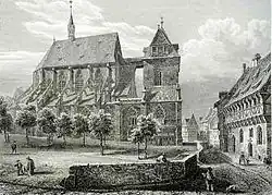 The building of the gothic church, in the basilica style and romanesque westwork, was begun at the end of the fourteenth century, the choir in 1389, the northern nave in 1404, and the tower in 1503. By 1504, the nave with its side altars was finished and all that remained to be completed was the tower. This was only done in 1883-1890, when the tower reached its current height. The interior, with the quire and the radiating side chapels to the east, was modeled after the French cathedrals.