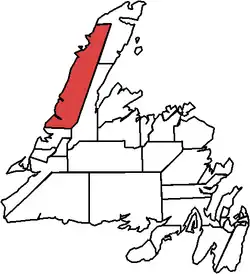 It included the communities of St. Barbe, Bartlett's Harbour, Bellburns, Bird Cove, Black Duck Cove, Blue Cove, Brig Bay, Castor River North, Castor River South, Cow Head, Daniel's Harbour, Eddie's Cove West, Forrester’s Point, Glenburnie-Birchy Head-Shoal Brook, Hawke's Bay, New Ferrole, Norris Point, Parsons Pond, Pigeon Cove, Plum Point, Pond Cove, Port aux Choix, Port Saunders, Portland Creek, Reef's Harbour, River of Ponds, Rocky Harbour St. Pauls, Sally's Cove, Shoal Cove West, Three Mile Rock, Trout River, Wiltondale, Woody Point.[3]
