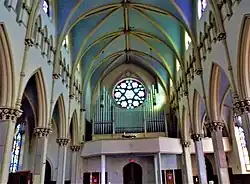 Besides the sanctuary windows, others also date to 1875, including a large rose window portraying St. Cecilia, as well as windows depicting St. Peter, St. Paul, and Dominican shields.[42] However, the majority of the church's stained glass windows were installed in 1965 and created by the Heimer[45] company.[1] The windows depict scenes from the life of St. Dominic and other Dominican saints.