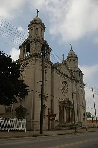 St. Elizabeth's first building with a basic Gothic Revival structure of brick, completed in 1893 and removed in 1917 for the construction of the present building. Although the cornerstone was laid in 1918,[5] the construction process was lengthy, and it was finally completed only in 1922.[3] Built primarily of limestone,[1] according to a design of Cleveland architect Emile Uhlrich, the church is an example of Italian-influenced Baroque Revival architecture, partly modelled after the church of Sant'Agnese in Agone in Rome.[5] Two great towers, topped with cupolas, form the ends of the facade, while a great rose sits in the middle section of the facade high above the main entrance. A flight of steps rises from the sidewalk to the central main entrance, which sits along the sidewalk with no setback.[6]
