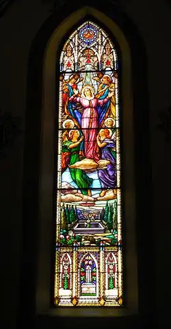 The stained glass windows were created by Guido Nincheri of Montreal sometime between 1941 and 1948. Nincheri also undertook replacing the interior church paintings. Further improvements that occurred during this period included; the replacement of the pews within the sanctuary, the altar, pulpit, choir loft, communion rail, flooring, confessionals, and the sloping ceiling. The chandeliers were replaced with indirect fluorescent lighting. Recessed lighting was installed over the side aisles. The majority of the carved oak interior woodwork was undertaken by local craftsman, Leopold Leclerc.[12]
