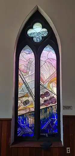 The gothic shaped window behind the altar was designed and created by parishioner Albert Angus MacDonald. Completed shortly before his death in 1986, the subject of the window is inspired by Revelation 4. On the left pane of the second row of the window, the shining star proclaims the birth of Jesus. In middle pane, the blood of the cross, depicted in red, represents that Jesus’ death on the cross releases the eternally accessible forgiveness and healing for the returning penitent. The Alpha-Omega symbol on the right pane represents his Resurrection and Presence for all those to discover and embrace. The scroll on the bottom left pane depicts God’s heart and will revealed to us through his Word and scripture. The font and chalice in middle pane represent the sacraments of Baptism and Communion. And, finally the butterfly in the bottom right represents the Holy Spirit transforming our lives.[9] The memorial window at the West end of the church is a visual representation of Psalm 150, made by Roz Sokolosky.