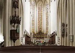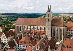 St. James Church (German: St. Jakobskirche) is a Gothic church in Rothenburg ob der Tauber, Germany. It was originally a Roman Catholic church but during the 16th century became a Lutheran church. The church is on a medieval pilgrimage route to St. James Church in Santiago de Compostela, Spain. It contains the celebrated Holy Blood Altarpiece by Tilman Riemenschneider[1] and a monumental altarpiece by Friedrich Herlin.[2] The church has two towers (south tower: 55.2 m, 57.7 m north tower).
