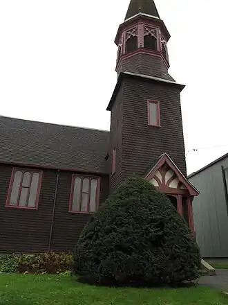 St. James Episcopal Church is located at the southwestern corner of Main and Center Streets in the very center of Old Town. It is a single-story wood frame structure with Gothic Revival styling. It is roughly rectangular in plan, with a gable roof and wood shingle siding, and rests on a stone foundation that was built for the congregation's original church in 1852. The tower projects near the western end of the long north side of the building, housing the main entrance at its ground level. The entry consists of double-leaf medieval doors, sheltered by a gabled portico with half-timbering in the gable end. At the second level the tower has a diamond-paned rectangular window, above which the tower transitions to an octagonal shape, with an open belfry whose openings are topped by Gothic tracery. An octagonal steeple caps the tower. A second section projects from near the eastern end of the northern long side. The gabled ends of the church have simple bargeboard decoration. The interior is relatively unaltered, having suffered minor damage in a 1952 fire.[3]