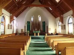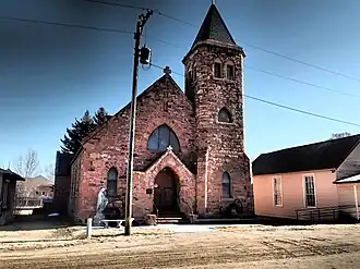 Built along a modified cruciform ecclesiastical Gothic plan, the sandstone church rests on an un-coursed granite foundation, and has to the right side of the main entrance a shouldered, three story, single bell tower with an octagonal roof. Decorative wooden fascia board encircles the church at the eaves. Windows along the nave, apse and on the tower are stained glass, produced in Minneapolis by the Forman Ford Company, and have Gothic stone arches with solid sandstone sills. Windows in the chancel and ambulatory are 1/1 double hung sash with stone lintels and sills. All window frames are original. Between 1956 and 1959, new concrete steps were constructed in both the front and rear of the building. From 1977 to 1981, deteriorating mortar in the foundation and walls was replaced, and the stained glass windows were covered on the exterior with Lexan. Solid oak doors in the front of the church were finished in 1983. The gable roof, which is covered with the original fish-scale patterned metal shingles, has four matching gable dormers on each side with single pane lancet windows. A cement-covered chimney pierces the roof at the rear of the building. The interior of the church remains essentially the same as when originally constructed in 1899. The vaulted ceiling has attractive, ornamental oak wood trusses, while oak wains coting, pews and furnishings still adorn the nave of the church. There is a hand-crafted oak reredos behind the altar which extends for the full height from the floor to the ceiling. Between 1956 and 1959, the semi-circular shaped chancel was extended five feet into the nave, and the church lights were replaced with contemporary spotlights. In 1984, the chancel was expanded into a circular shape and the interior was carpeted. The original wood frame Catholic church and rectory, built in1875 are located adjacent to St. Mary of the Assumption church.[2]