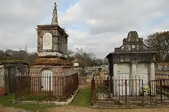 - a cemetery "consisting mainly of fairly ordinary above-ground tombs ... noteworthy for three high style Renaissance Revival tombs near the entrance. The Welham tomb is particularly significant with its castiron vermiculated quoins and arches."[2]