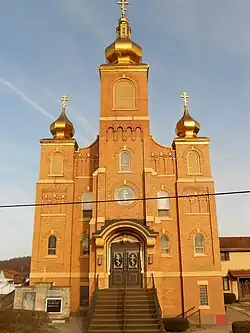 St. Nicholas Byzantine Catholic Church, also known as St. Nicholas Greek Catholic Church, is a historic Catholic Church church at 504 S. Liberty Street in Perryopolis, Fayette County, Pennsylvania. It was built between 1912 and 1918, and is a 30 feet by 60 feet yellow brick building in the Byzantine Revival style. It has a cruciform plan and the gabled roof is topped by four onion domes. The church served a community of Rusyns who originally settled in the area prior to 1907.[2]