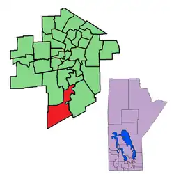 It was recreated by redistribution in 1979, and was contested at the 1981 Manitoba general election. It was abolished at the redistribution of 2018 and ceased to exist under its old name effective at the 2019 Manitoba general election. The riding was located in the southernmost tip of the City of Winnipeg.