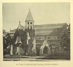 In 1841, the Rev. Alexander Sanson, rector of St. John's, York Mills, decided to establish an Anglican parish at the corner of Tollgate Road (now known as Bloor Street) and Yonge Street.[2] He commissioned the architect John George Howard to begin construction. This small wooden church, known as the 'little church up Yonge Street', opened on June 12, 1842. The first rector was the Rev. Charles Matthews, and the congregation originally had 100 parishioners. Tollgate Road became St. Paul's Road shortly after the church's construction, then the name was changed to Sydenham Road in 1844 and eventually to Bloor Street in 1854.[3]