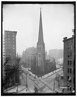 St. Paul's Cathedral is the cathedral of the Episcopal Diocese of Western New York and a landmark of downtown Buffalo, New York. The church sits on a triangular lot bounded by Church St., Pearl St., Erie St., and Main St. It was built in 1849–1851 to a design by Richard Upjohn, and was believed by him to be his finest work. Its interior was gutted by fire in 1888, and was redesigned thereafter by Robert W. Gibson, and it was designated a National Historic Landmark in 1987 for its architecture.