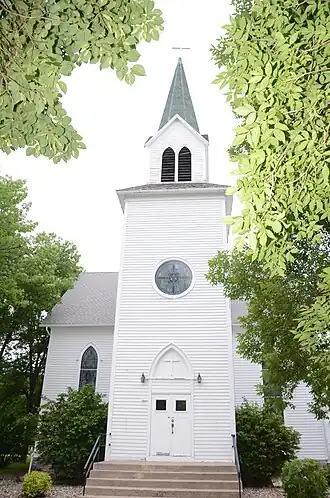 The church is an excellent example of Carpenter Gothic church architecture in Minnesota. It is built of wood frame construction with lap siding on a limestone foundation. The entrance is at the base of a three-story bell tower topped by an octagonal steeple. The interior has a Gothic altar and a semicircular communion rail.[3]