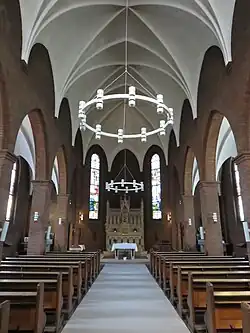 Much of the interior furnishings are from Belgium and were acquired with the assistance of Josef Ludwig Brems, Vicar Apostolic of Denmark 1922–1938. The three carved altars and the stations of the Cross were created in Pierre de Caen limestone. The windows with glass mosaics are also from Belgium.