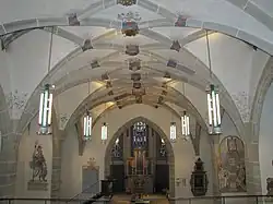 A comprehensive restoration of the church interior took place in 1965 under the direction of architect Paul Heim. In the process, an oil-fired forced-air heating system was installed, wall and vault paintings were uncovered, and some changes from the 1913 renovation were reversed.[2] An extensive renovation of the roof truss in 2007 cost 480,000 euros.