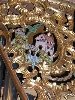 In the course of the church renovation in 2009, two stops were added to the Hauptwerk. In addition, the organ was given a new large pedalboard movement, so that the bass movement - previously also the pedalboard - now became exclusively the manual movement.[16] Since 2009, the slider chest instrument has 32 stops on three manual movements and pedalboard. The actions are mechanical, the stop action is additionally electric and connected to a setting system. The temperament is unequal temperament according to Kirnberger II. The organ has the following stoplist (for the individual stop names, see the list of pipe organ stops):[15][17]
