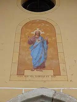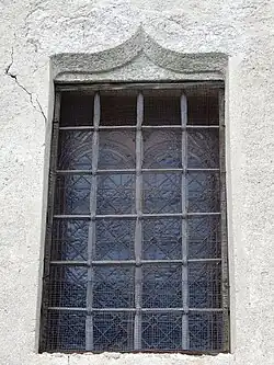 The church features a three-nave structure and a semicircular apse. The organ loft, dating back to the 19th century, is made of carved walnut panels depicting musical instruments and leaves.[1] On the main façade, flanked at the corners by two stone buttresses, is a finely carved stone entrance portal dating back to the late Gothic period.[1][2]