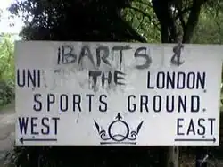 Until 1892 the various Athletic Clubs were separately maintained by the members of the individual clubs, with St Bart's playing at the Spotted Dog ground in Upton Park,[8] but in 1892 it was finally decided that a fixed subscription should be paid by all students, and should be collected and administered by the School authorities. An entrance fee of five guineas entitled students to life membership of the Abernethian Society, Athletic, Boxing, Boating, Cricket, Lawn Tennis, Rugby, Swimming and Association Football Clubs which led to the acquisition of a sports ground by the College Committee at Winchmore Hill for £8,000 and a pavilion was erected and suitable pitches and tennis courts were laid out. The ground was taken over by the Amalgamated Clubs in 1895. Prior to the acquisition of the sports ground at Winchmore Hill, the club played their home games at the Spotted Dog ground at Upton Lane.[9]