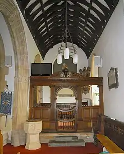 Further restoration took place under James Fowler[2][4] in 1876 when the box pews in the nave were replaced with the current pews and the elevated gallery was removed. The vestry was enlarged and parts of the chancel were rebuilt. The Last Supper reredos above the altar dates from this period while a new pulpit of Caen stone was installed; this has carvings of St John the Baptist in the wilderness, the Sermon on the Mount and Saint Paul in Athens. There are unceiled waggon roofs to nave and south aisle with carved bosses at each of the intersections. The arcade of bays has Pevsner 'B' type piers[4] with leaf capitals to the main shafts.[2][7]