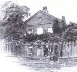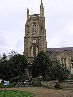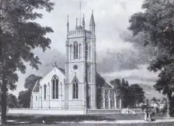 Leytonstone originally formed a part of the ancient parish of Leyton, for which the only Anglican place of worship was Leyton Parish Church.[2] In 1748, some wealthy residents proposed that a chapel of ease should be built in Leytonstone, then a rural but prosperous village; one of them complained that "the inhabitants in general find it very inconvenient, and many utterly impossible, for them to resort thither [to Leyton] at least so frequently as they ought for ye public worship of God".[3] Despite the opposition of the lord of the manor, David Gansel of Leyton Grange, and the ambivalence the vicar of Leyton, a plot of land was leased on the west side of Leytonstone High Road and a small chapel was built on it, funded by residents including the poet David Lewis and the banker Samuel Bosanquet. The chapel opened in 1749, but was closed soon afterwards when Gansel took legal action to prevent its use, until 1754 when a minister was appointed by the Bishop of London with a stipend provided by pew rents. In 1819 the chapel was enlarged, but because it was built on leasehold estate, it could not be consecrated, although the bishop agreed that it could be licensed for the administration of sacraments.[2] The enlarged chapel, which stood opposite where Barclay Road now joins the High Road, was able to seat 580, with 240 seats being rent free for those unable to pay.[4]