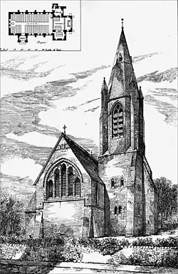 The church was built in 1878 to 1879 and designed by the Chester architect John Douglas. It is in brown rubble stone with dressings of red Helsby sandstone and a red-tiled roof. The interior is broad, without aisles.[1]