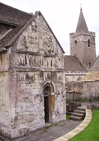 The church is dedicated to St Laurence, and documentary sources suggest it may have been founded by Saint Aldhelm around 700, although the architectural style suggests a 10th- or 11th-century date.[1] St Laurence's stands on rising ground close to the larger Norman parish church of the Holy Trinity.