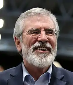 1948 | Irish Republican politician; president of Sinn Féin (1983 - 2018); elected Member of Parliament (MP) of the UK Parliament for the Belfast West constituency (1983-1992 and 1997-2011), but followed the policy of abstentionism; elected Teachta Dála (TD) for Louth (2011–2020)[45] | |