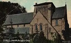 The church was built between 1870 and 1873 to accommodate the increasing numbers of summer visitors to the area. It was designed by the Lancaster partnership of Paley and Austin, the commission being gained as a result of a competition won by Hubert Austin. The principal benefactor was the Liverpool businessman Charles Kurtz. The church was consecrated in July 1873, and provided seating for 150 people.[3] It replaced a medieval church dedicated to Saint Michael, and cost £5,000 (equivalent to £560,000 in 2023).[4] The tower was completed in 1907, but has never held any bells.[2] Subject to funds being available, the ring of eight bells from Porthmadog church are scheduled to be transferred to St. Mary's.[5][6]