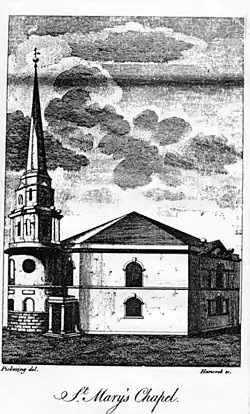 St. Mary's Church was built in 1774, under an Act of 1772,[1][2] on Catharine Street (later renamed Whittall Street), then on the northern edge of the town of Birmingham, as a chapel of ease to St Martin in the Bull Ring. The building was designed by Joseph Pickford.[3] It was named to mark the donation of the land on which it stood, and £1,000 of its £4,500 building costs, by Mary Weaman.