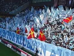 In tribute to former manager Roy Hodgson and his successful time at Malmö, the club's fans have unofficially named the upper corner of the Eastern Stand closest to the Northern Stand "Roy's Hörna" (Roy's Corner).[23] The corresponding corner of the Western Stand on the other side of the Northern Stand is named "Bob's Hörna" (Bob's Corner) in tribute to Bob Houghton.[24] These sections are known as "Sjungande sittplats" (Singing seating) since the two sections are fitted with seats but where the majority of the spectators are standing fans that sings in correlation with the fans on the terracing at the Northern Stand between the two sections.[24] Both Hodgson and Houghton had successful managerial careers at Malmö FF, they both won multiple league and cup titles while at the club.[25]
