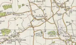The name Stanfield translates to 'stony open land'. It derived from the Anglo-Saxon word 'stan' meaning stone or rock and 'feld' which means 'open country' or 'unencumbered ground'.[4] In northern nations, stones were placed to serve as boundary marks. It was also placed on memorials to be able to distinguish those who had fought in battle, which then became practised by Odin as an act of sacred duty.[5] The word 'stein' is a personal name in the Domesday Book, in which this village used to be recognised as Stanfelda.[5]