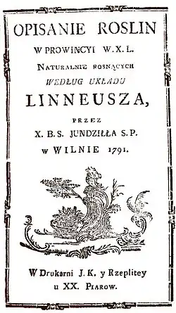 Despite his religious training Jundziłł adopted naturalism[2] and was one of the first to teach veterinary medicine in Lithuania and was the author of several basic textbooks on botany and zoology. His studies of migratory birds were among the earliest in that area.