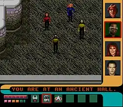 Away Mission - The player controls four members of an away team. The player can control each one in turn by switching to the respective portrait. Certain characters have different abilities based on their service branch.