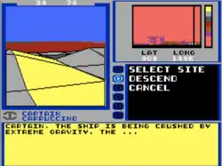 Two modes of space travel exist: interstellar and interplanetary. Interstellar travel involves the player maneuvering the spaceship from one star to another, sometimes with the aid of continuum fluxes or jump pods, both of which provide a quick shortcut between two distant points in space. When the player maneuvers the spaceship towards a star, the interplanetary travel mode begins. A schematic showing the relative positions of the planets in that solar system appears in the auxiliary view screen, all of which may be orbited by the player's spaceship and scanned to reveal basic information including the planet's gravitational strength. Large planets with strong gravity, such as gas giants, will destroy the ship if a landing is attempted, but the ship may successfully land on many worlds. When the player is ready to land, the auxiliary view screen displays a planetary topographic map with a cursor allowing a specific location to be selected.[5] Following a successful landing, the crew boards a terrain vehicle which the player is able to move about the planet to explore ruins for plot clues, harvest minerals and alien lifeforms, and travel to trading posts at which the player may buy or sell items through bartering. The main view screen shows the terrain vehicle in relation to its immediate surroundings. Potential hazards on planetary excursions include running out of fuel, dangerous weather conditions, and hostile alien lifeforms.[2][6] The locations of uninhabited earth-like planets may be logged for recommendation to Interstel as potential colony worlds in return for a substantial monetary reward.[7]