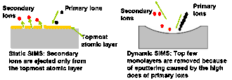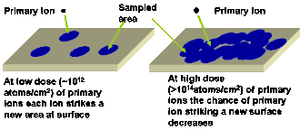 Ion bombardment of a surface may result in a drastic change of its chemical composition and structure. These changes include sputtering, amorphization, implantation, diffusion, chemical reactions, and so on. All these changes are limited to a small region surrounding the path of the primary ion into the solid. For static SIMS, each subsequent primary ion hits an undamaged area and a total of only 0.1-1% of the atomic sites are bombarded during the measurement. To ensure this, very low primary current densities are used, generally in the range of 10−10 to 10−9 A/cm2 (primary ion dose is below 1012 – 1013 ions/cm2). This leads to extremely small sputtering rates of fraction of a monolayer per hour and hence small secondary-ion current density. Additionally, these emitted secondary ions are of low kinetic energy and emitted up to 20 nm from the impact site with surface annealing occurring in femtoseconds. These reasons make SSIMS a purely surface analysis technique causing negligible damage to the surface and with detection limits as low as 10−8 monolayer (ML).[2]