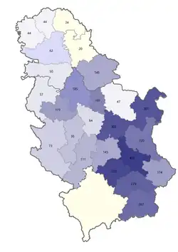 COVID-19 infected inhabitants per 100,000 people in Districts of Serbia without Kosovo* (2 June 2020)