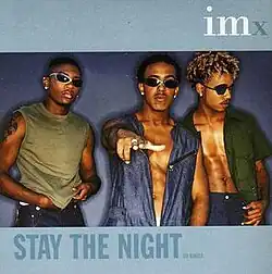 "Stay the Night" is the lead single from IMx's fifth album, Introducing IMx. It reached No. 23 on the Billboard Hot 100 singles chart and No. 20 on the Hot R&B/Hip-Hop Singles chart in late 1999.[1] It was the group's most successful single as IMx, becoming their third single to earn a gold certification, achieving the feat on December 23, 1999, a little over two months after its release.