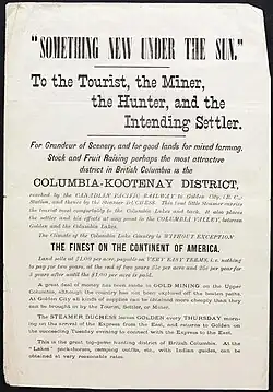 In the early 1880s a wealthy European adventurer, William Adolf Baillie-Grohman (1851–1921), travelled to the Kootenay Region and became obsessed with developing an area far down the Kootenay River near the southern end of Kootenay Lake called Kootenay Flats, near the modern town of Creston, BC.[11][12][13] The problem for Baillie-Grohman was that the Kootenay River kept flooding Kootenay Flats. Baillie-Grohman thought the downstream flooding could be lessened by diverting the upstream portion of the Kootenay River into the Columbia River through the Canal Flats. This would have increased the water flow through the Columbia River, particularly near Golden and Donald, where Baillie-Grohman's proposal, if it had been implemented, would have threatened to flood the newly built transcontinental railroad and other areas of the Columbia Valley.[14]